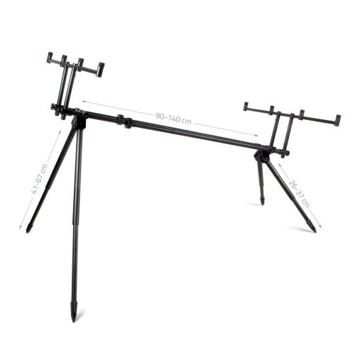 A négybotos kereszttartónak köszönhetően botjainkat tetszés szerinti távolságban helyezhetjük el egymástól. Az önzáró teleszkópos lábak fokozatmentes láb beállítást tesznek lehetővé, illetve az állítható magasságú kereszttartókkal tudjuk a rod pod súlypontját lejjebb vinni, ami nagyon előnyös szeles időben. A kontraanyás kereszttartókon a kapásjelzők és bottartófejek egyszerűen lefixálhatóak a helyes állásba. Párnázott hordozó táska védi a szállitási sérülésektől.