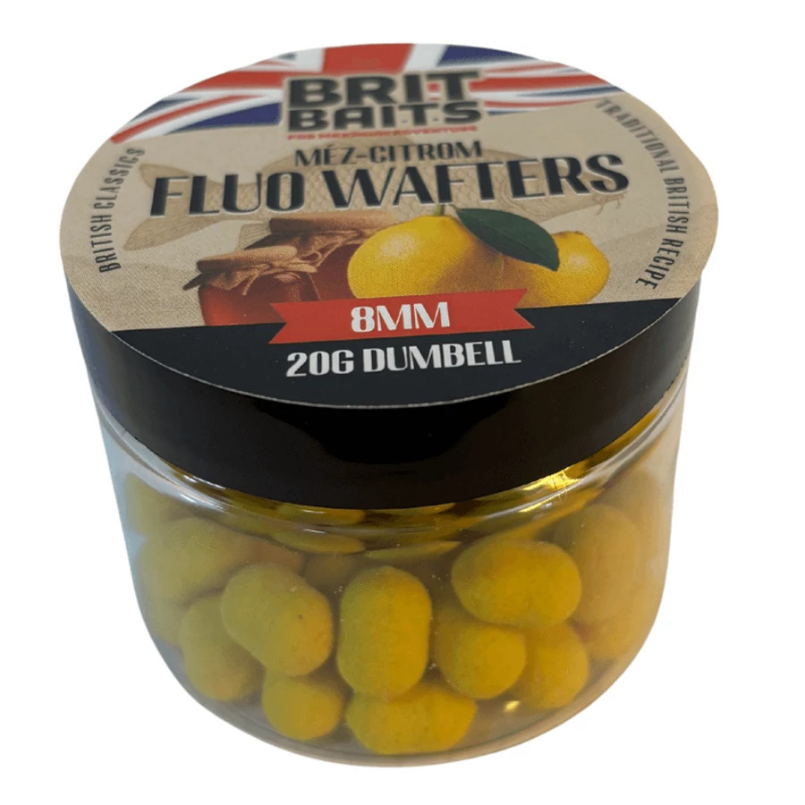 A BritBaits Méz–Citrom Fluo Wafters Dumbell – 8 mm egy egyszínű, fluo sárga, kiegyensúlyozott lebegésű horogcsali, amely természetes, bizalmat ébresztő aromájával és látványos megjelenésével dolgozik – különösen jól működik óvatos vagy túletetett halaknál.