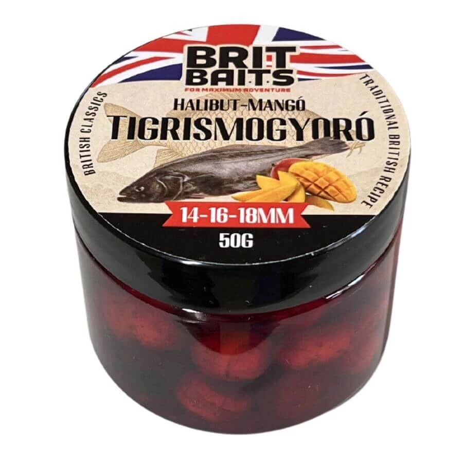 A BritBaits főtt, színezett tigrismogyoró egy prémium minőségű, 14–16-18  mm-es, nagy szemű horogcsali, amely pontyok és amurok egyik legkedveltebb természetes csemegéje. A szemek kívül-belül színezettek, és sűrű, intenzív színfelhőt képző gélben érkeznek, amely már az első percben „életre kelti” a csalit a vízben.