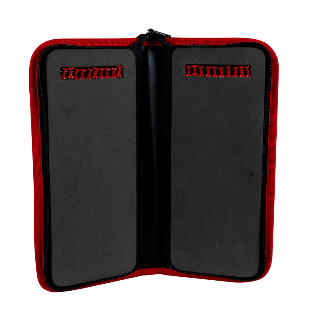A táska merevített kivitelű, külseje ellenálló anyagból készült, praktikus cipzározással. Kinyitva mind a két oldala felhasználható a kész előkék biztos tárolására.