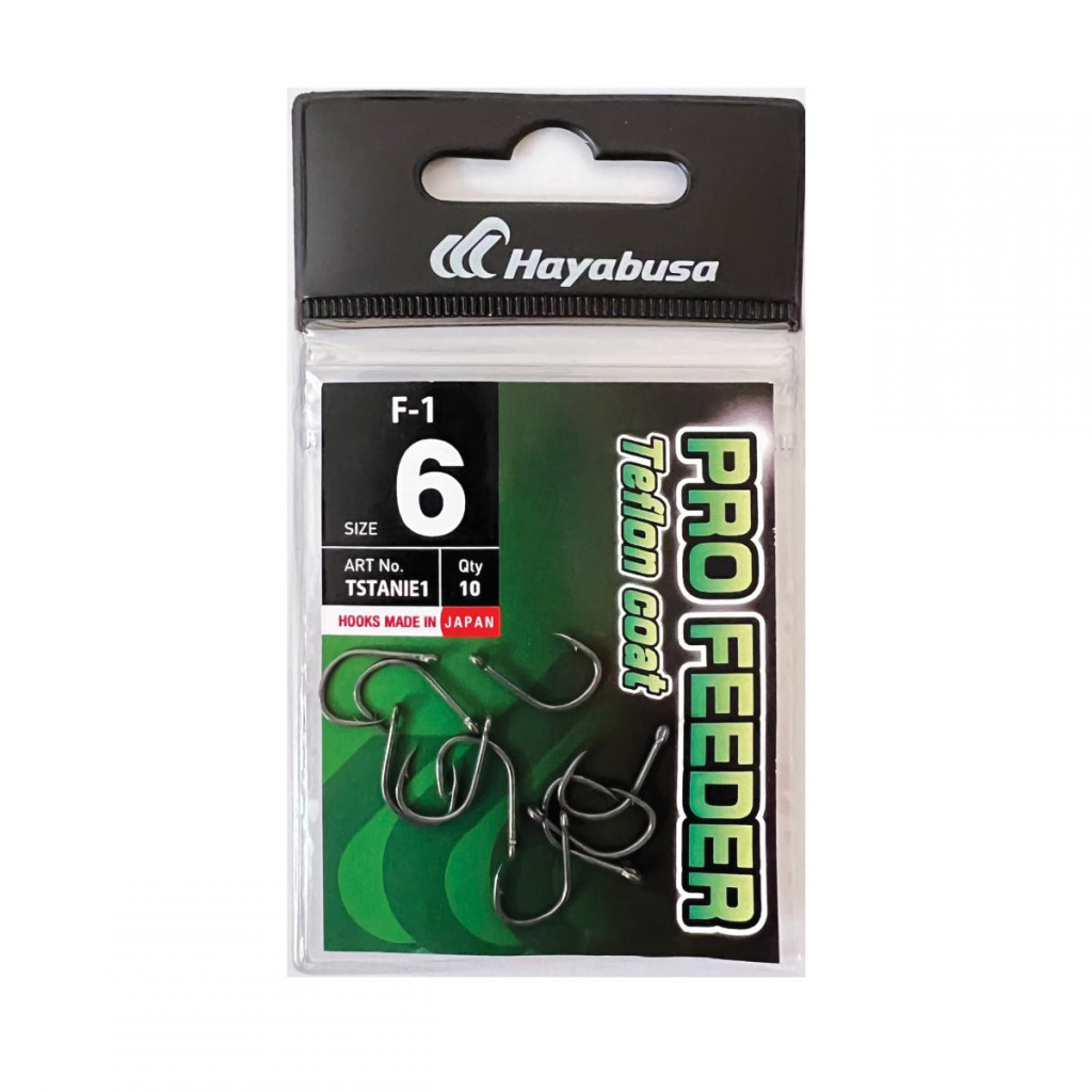 HAYABUSA F1 Feeder Teflon coated horog. Ezek a feederhorgászathoz tervezett, füles horgok elengedhetetlenek a fogós és biztonságos szerelékek elkészítéséhez. A Hayabusa F1 Feeder NRB(non reflective/nem csillan) modell robusztus formájával, rövid szárával és nagy öblével tűnik ki, így többféle csalihoz alkalmas, beleértve a puha pelleteket, vagy kukoricaszemeket. Ezeket a horgokat nagy teherbírásra tervezték. A speciális Teflon bevonat csökkenti a tükröződést, a szem pedig lehetővé teszi a könnyű megkötést gyors kötéssel/kapoccsal és a vékony fonott zsinórokkal való használatot.