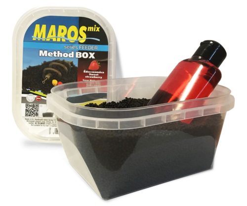 A Maros Method Pellet Box 500 gramm micropelletet és 10A prémium minőségű halibut pelletnek és rendkívül tömény aromának köszönhetően az egyik legfogósabb pontyos etetőanyagnak számít a Method Box.  Egy éven keresztül, számos vízen bizonyította fogósságát olyan körülmények között is, amikor a legtöbb etetőanyag és csali kudarcot vallott. 500+100 grammos kiszerelésben kapható. A Method Box-ban található aroma... Minden Method Box tartalmaz egy deciliter Maros Mix Extra Aktivátort, ami nem más, mint egy ízletes, tömény aroma. Különleges alapanyagának köszönhetően, oldódás közben ez az adalék, horizontálisan a fenéken terjed. Ennek oka, hogy a pontyfélék elsősorban a fenék közelében táplálkoznak, az aktivátor segítségével pedig sokkal hamarabb rátalálnak az etetésre.0 gramm locsolószirupot tartalmaz.