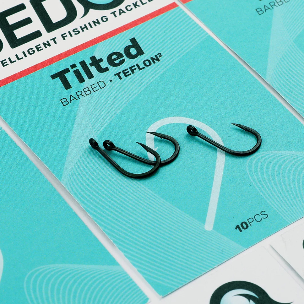 A megdöntött szárú horog  két közkedvelt típus ötvözete. Wide Gape és az Anti Snag hook – ot gyúrták össze.  A Tilted hook – nak 15 fokban meg van döntve a horogszára ezért a horoghegy és a horogszár kisebb szöget zár be mint a horog öble. Ezáltal hatalmas stabilitást ad a horognak akadáskor és a horog kiakadás esélye minimálisra csökkent. Felhasználási módja a Tilted Hooknak igen széles. Nyílt vízen, akadókban extrém környezetben is megállja a helyét. Bármilyen csalizási formához alkalmas, süllyedő, hóember vagy popuphoz egyaránt. Black Line Aligner – rel lesz tökéletes a végszerelék.