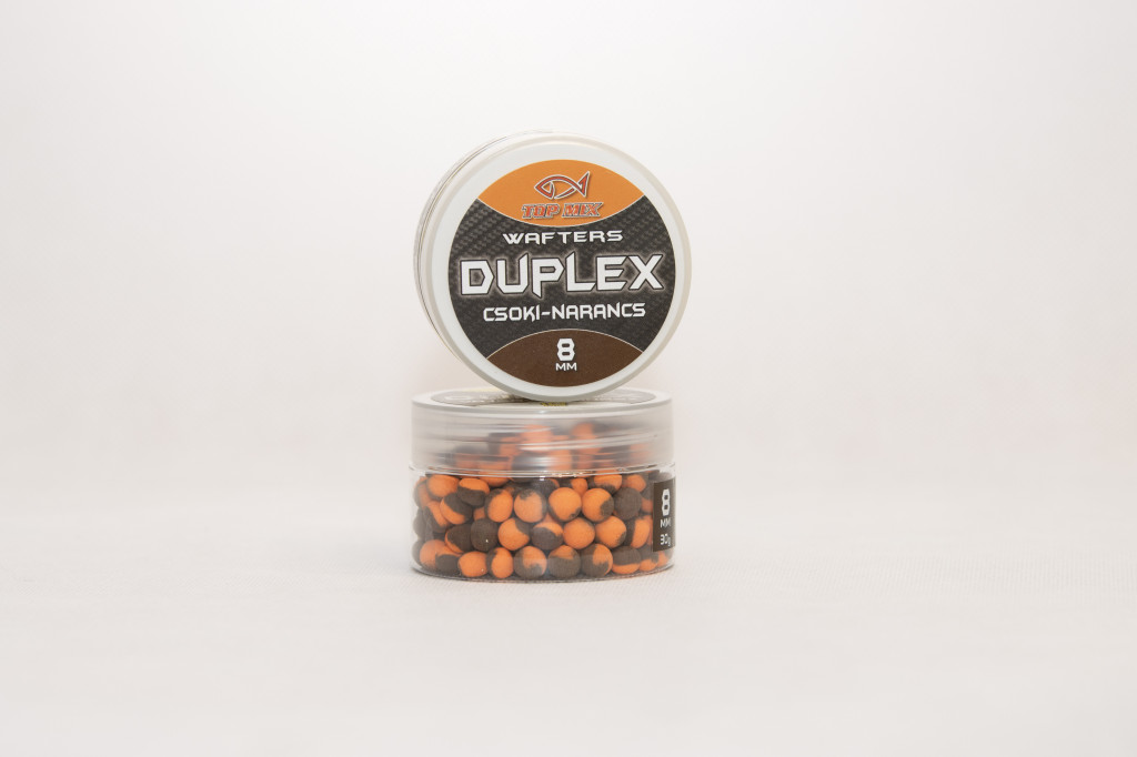 A Top Mix Duplex wafters termékcsalád tagjai azoknak a feeder horgászoknak készültek, akik szeretik az attraktív oldódó csalikat. Kikönnyített pelletek, de épp csak annyira, hogy fine tüske mellett #14 horgokkal is használhatók legyenek a legkisebb, 8-as méretek. 8mm, 10mm és 12mm méretekben kapható minden íz. Oldódási képessége intenzív, "nyitott csali", hogy az aroma mellett beltartalmi értéke is csalogassa az oda tévedő halakat. Dupla színösszeállítás mellett ugyanazzal a csalival különböző fényviszonyok mellett is horgászhatunk, egyszerűen a másik oldalról tűzzük fel a csalinkat, máris más tónusú, de ugyanolyan színvilágú csalink lesz a horog mellett.