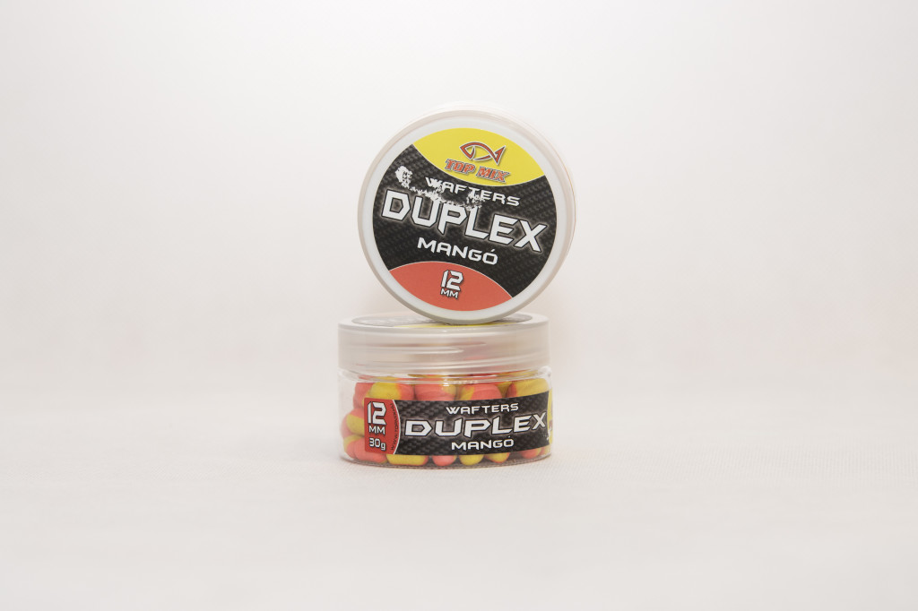 A Top Mix Duplex wafters termékcsalád tagjai azoknak a feeder horgászoknak készültek, akik szeretik az attraktív oldódó csalikat. Kikönnyített pelletek, de épp csak annyira, hogy fine tüske mellett #14 horgokkal is használhatók legyenek a legkisebb, 8-as méretek. 8mm, 10mm és 12mm méretekben kapható minden íz. Oldódási képessége intenzív, "nyitott csali", hogy az aroma mellett beltartalmi értéke is csalogassa az oda tévedő halakat. Dupla színösszeállítás mellett ugyanazzal a csalival különböző fényviszonyok mellett is horgászhatunk, egyszerűen a másik oldalról tűzzük fel a csalinkat, máris más tónusú, de ugyanolyan színvilágú csalink lesz a horog mellett.