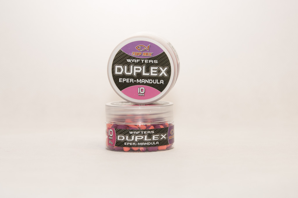 A Top Mix Duplex wafters termékcsalád tagjai azoknak a feeder horgászoknak készültek, akik szeretik az attraktív oldódó csalikat. Kikönnyített pelletek, de épp csak annyira, hogy fine tüske mellett #14 horgokkal is használhatók legyenek a legkisebb, 8-as méretek. 8mm, 10mm és 12mm méretekben kapható minden íz. Oldódási képessége intenzív, "nyitott csali", hogy az aroma mellett beltartalmi értéke is csalogassa az oda tévedő halakat. Dupla színösszeállítás mellett ugyanazzal a csalival különböző fényviszonyok mellett is horgászhatunk, egyszerűen a másik oldalról tűzzük fel a csalinkat, máris más tónusú, de ugyanolyan színvilágú csalink lesz a horog mellett.